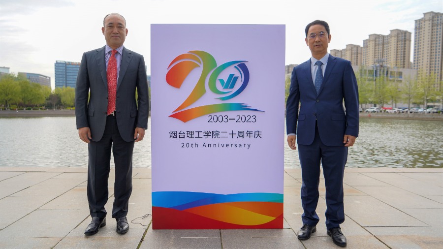 煙臺理工學院黨委書記盛國軍主持并介紹本次活動內(nèi)容,辛軍董事長、于光輝校長共同為校慶20周年LOGO揭彩。