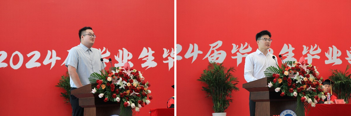 教師代表外國(guó)語學(xué)院徐家南、畢業(yè)生代表人工智能學(xué)院丁天舉分別上臺(tái)并發(fā)言。優(yōu)秀畢業(yè)生代表向老師敬獻(xiàn)鮮花以表師恩難忘。
