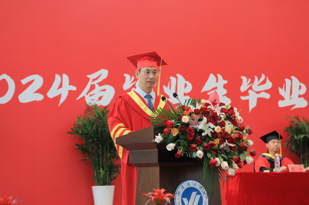 大會(huì)最后,煙臺(tái)理工學(xué)院校長(zhǎng)于光輝發(fā)表了講話。于校長(zhǎng)首先代表學(xué)校向圓滿完成學(xué)業(yè)的畢業(yè)生表示衷心祝賀,感謝2024屆本科畢業(yè)生在四年的時(shí)光中,陪伴煙臺(tái)理工學(xué)院共同成長(zhǎng)進(jìn)步。期望同學(xué)們?cè)谖磥淼纳钪斜?ldquo;和合”精神,學(xué)會(huì)溝通合作;永葆熱愛,心懷家國(guó);心懷勇氣,不懈拼搏,奔赴星辰大海。