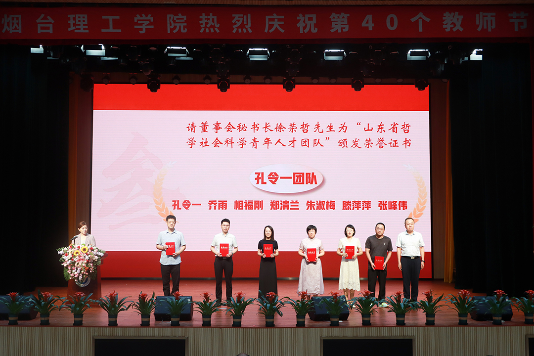 于光輝校長為校級(jí)教學(xué)競賽獲獎(jiǎng)教師代表頒發(fā)榮譽(yù)證書;董事會(huì)秘書長徐榮哲先生給“山東省哲學(xué)社會(huì)科學(xué)青年人才團(tuán)隊(duì)”頒發(fā)榮譽(yù)證書;黨委書記盛國軍教授為“山東高校優(yōu)秀輔導(dǎo)員”頒發(fā)榮譽(yù)證書。